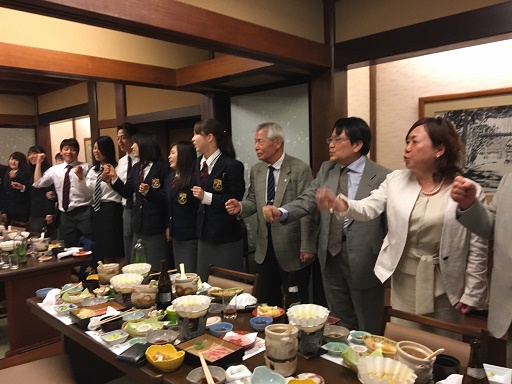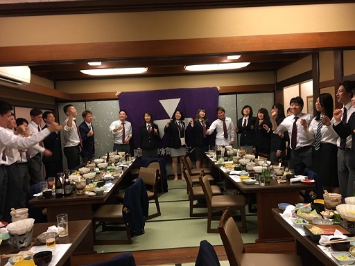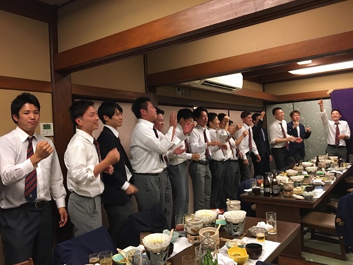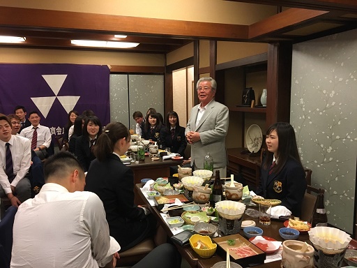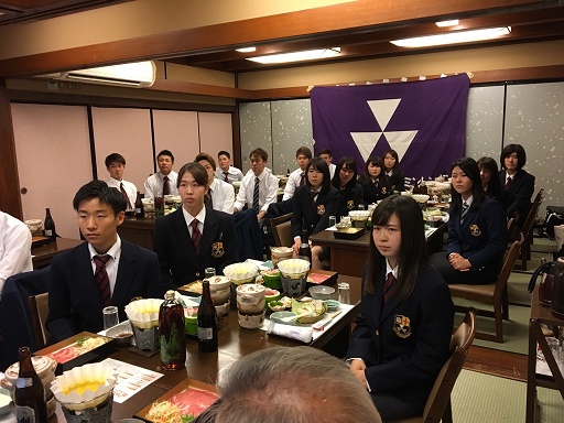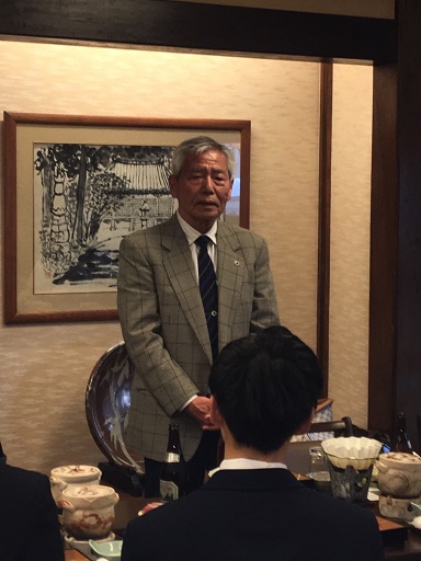 竹廣部長、岸本常任顧問、小国会長から新入生歓迎の挨拶があり、村尾監督の乾杯音頭で会が