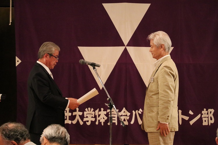 山本前監督への感謝状を代理で受け取る小草興司OB(1966年卒)