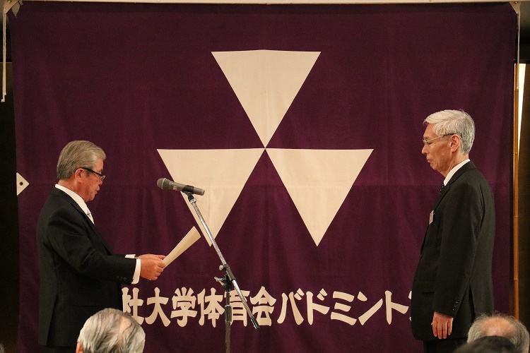 【クラーク】(来賓)上田学生支援センター所長、沖田体育会長、田中京都府バドミントン協会会長、鵤木関西学連会長、大島ユニオン副会長、大日ユニオン副会長、藤原ユニオン理事長、宇野原ユニオン常任顧問、小国OB・OG会長