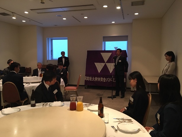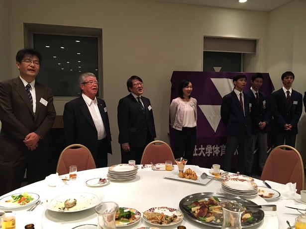 竹廣良司部長(経済学部教授/図書館長)、豊原洋治OB・OG会名誉会長(1964年法学部卒)、柴田幸典OB・OG会副会長(1987年工学部卒)、鷲江京子OB・OG会幹事長(1975年文学部卒)、村尾勉女子監督(1984年文学部卒)、西山智監督(2008年経済学部卒)、伊佐俊彦女子コーチ(2011年経済学部卒)、足立秀樹(1978年法学部卒)、佐藤靖子OB・OG会幹事(2007年文学部卒)、大道丈(2010年法学部卒)、増木圭(2010年商学部卒)、福家康記(2011年文化情報学部卒)、