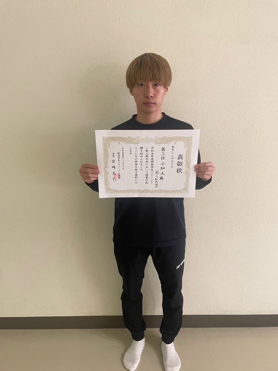 11/30 関西学生新人戦大会男子シングルスで小畑洸稀(理工1)が3位