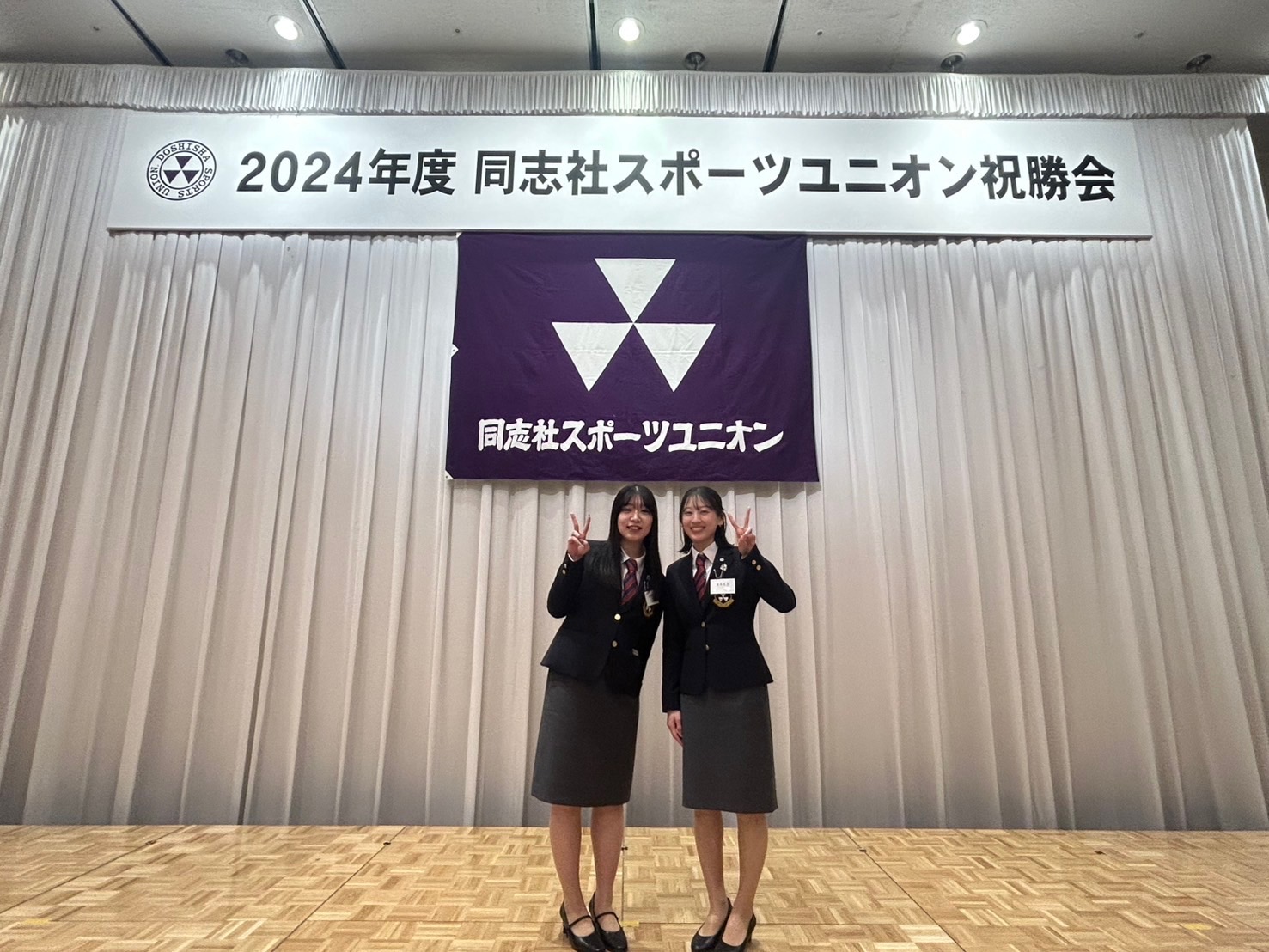今年度顕著な活躍をした体育会学生を表彰するため、「2024年度同志社スポーツユニオン祝勝会」が京都ホテルオークラで開催されました。6月の関西学生選手権女子ダブルスAで優勝、10月に京都で開催の全日本学生選手権女子ダブルスで過去最高の3位に入り、全日本総合選手権に本選から出場した播摩朋奈(商4)・東 美衣奈(商3)が表彰されました。