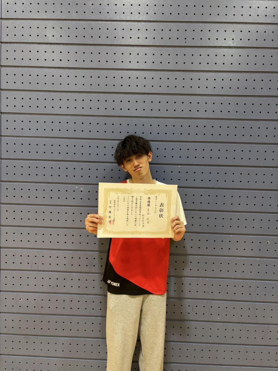 今大会では、山本が男子シングルスにおいてベスト8入りを果たしました。準々決勝では、2年連続で優勝を果たしている関西の絶対王者・衣川選手(立命館)と対戦しました。第1ゲーム中盤には16-13とリードし、流れを完全に掴みかける場面もありました。山本の豪快なスマッシュと粘り強いラリーは、会場でも存在感を放っていましたが、王者の経験値と試合巧者ぶりの前にあと一歩及ばず、惜しくも敗戦となりました。とはいえ、歴代王者を相手にここまで食らいついたその内容は、今後の飛躍を感じさせる価値ある一戦だったといえます。