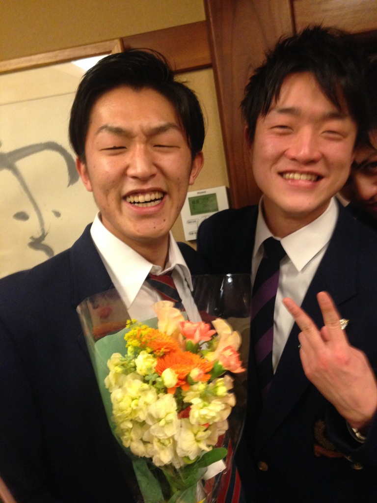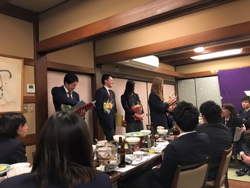 今年も「追い出しコンパ」が盛大に行われました。伊藤先輩から卒業生に赤ワインが、そして豊原先輩(同志社スポーツユニオン会長)からはポール・スミスの手帳がプレゼントされました。